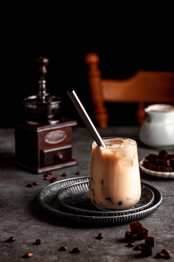 It’s basically just iced coffee decked out with pearls and coffee jelly (made with agar agar, but with a gelatine option!), sweetened with a brown sugar syrup. Turning your coffee into a dessert affair.